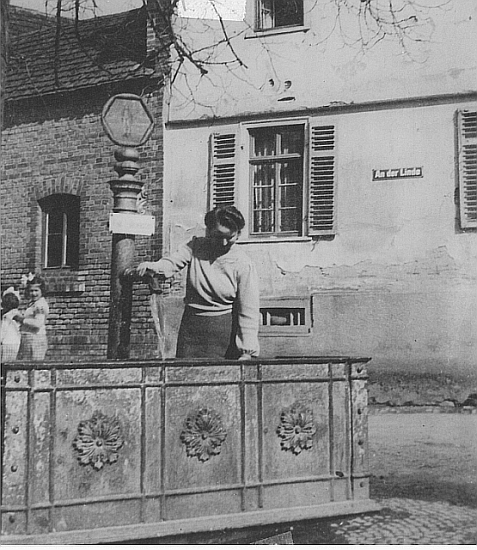 Das 2te gusseiserne Basain in der Dorfmitte mit Kinder 1940