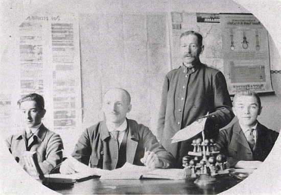Die Bediensten zur Eingemeindung 1928, von links nach rechts: Karl o. August Schwalbach Gemeinde-Schreiber Heinrich Becker Gemeinde-Rechner Heinrich Will Nachtwächter Arthur Streck Gemeinde Schreiber