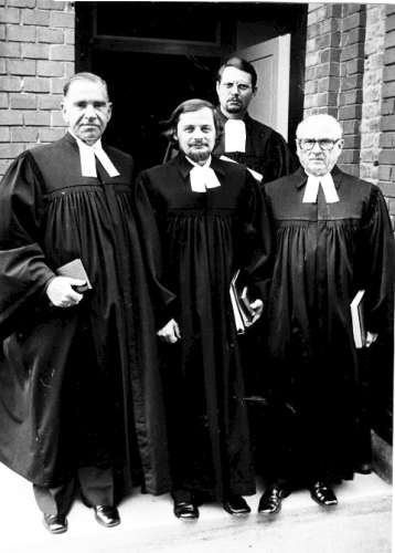 Links Pfarrer Conradi, mittel Pfarrer Heinrich, 3. von links hinten Pfarrer Strub, rechts Dekan Geibel
